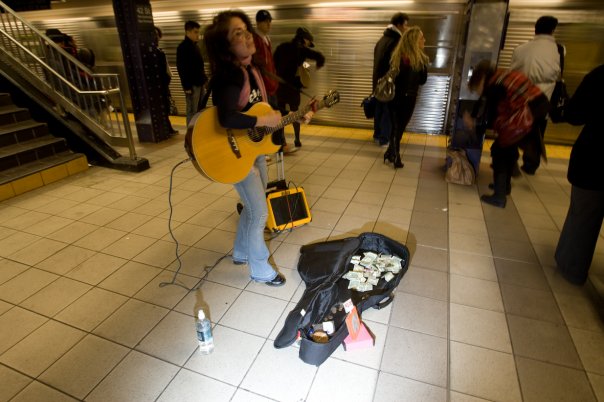 It felt like 100 degrees underground this evening & still, this guy….one of my two favourite maintenance workers displayed in front of me, a little miracle that ’caused me to stop playing. And I never stop playing save the NYPD threatening wrongful arrest. Thought the heat had left most everyone on the platform close to comatose, only able to nod or grin their approval as opening a bag or purse risked being even more miserable than they already were.Through the heat, this guy continued his diligent sweeping & picking up trash. He’d finished the platform & had gotten to the stairs with one foot up on the lowest step, broom in hand, handled dustpan in the other, ready to sweep them clear of debris when a homeless guy, toothless, hunched over & skinnier than most, came up behind him. I kept on singing, playing & watching, ’till I saw the maintenance guy, sensing someone behind him, turned around, look at the emaciated homeless man in the eye, nodded, tucked his broom & dustpan under his arm, reach into his pants pocket & pulled out his wallet. He then proceeded to pull out a dollar bill & give it to the skinny, toothless guy standing in front of him. I stopped playing, chills were running up & down my arms when my eye’s met those of the maintenance worker’s. I touched my heart, smiled a very small, private smile & nodded. He awkwardly & sheepishly took in the confirmation as if he were far more comfortable with anonymity than acknowledgment and quickly resumed his sweeping.