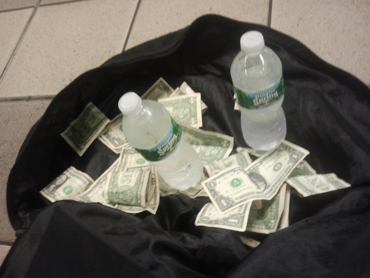 A few songs more & the E pulled up, the crowd flooded off  & started up the two sets of stairs of the platform.  One guy in a kind of casual business suit thing, stopped, looked back  and stood there for a few seconds while I sang. He then walked back down the stairs, found a seat on the bench closest to me & sat there while I sang. I finished the song, leaned down to pick up my tuner when a hand holding a $20 appeared in my guitar case. I looked up. It was the man, He got it, he really got it, he got what I was saying in the song & was moved. As he dropped the twenty he did that ‘thing’ where an appreciative audience member will touch their heart with their hand & nod a few times in recognition. Then he went back to what he had begun 3 minutes prior, ascending the stairs out of the trains.