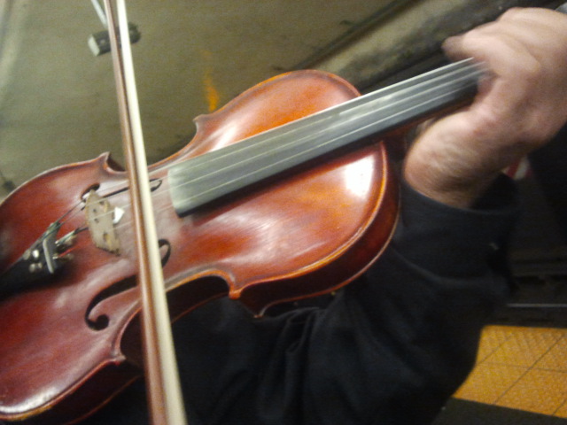 There’s this violin player on the 7 who is always happy & always cheerily fiddlin’ away despite his accompanying sign that pleads for help for his wife who, apparently needs a liver transplant & has for a very long time… He’s there every afternoon as I hop on & off the 7 train while busking. Today he motioned me over as he was counting bills, big bills, $20’s $50’s etc & in English/Italian said; “You know how much I make?”